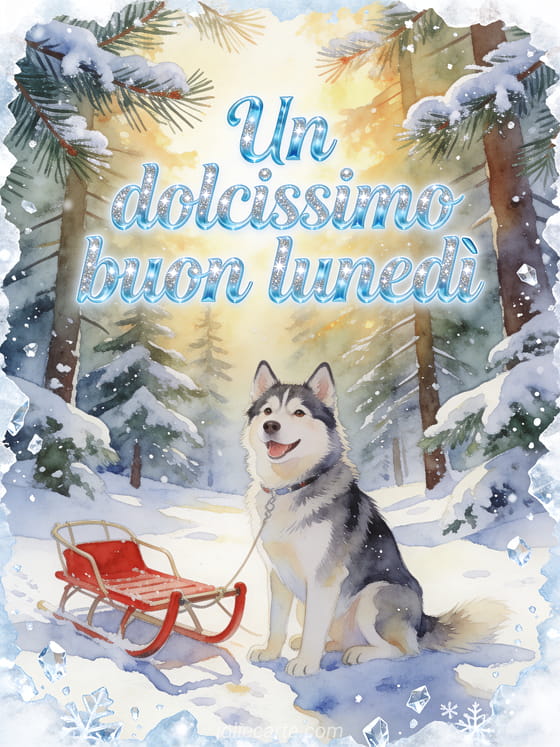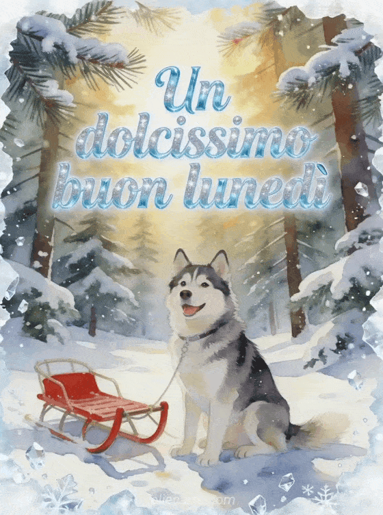 Invia un saluto tenero di buon lunedì con un cane husky allegro seduto accanto a una slitta rossa in una radura innevata di pini, con aghi gelati e cristalli di neve scintillanti. Scopri anche buon lunedì buon inizio settimana immagini, buon lunedì immagini gif o buongiorno del lunedì gif.