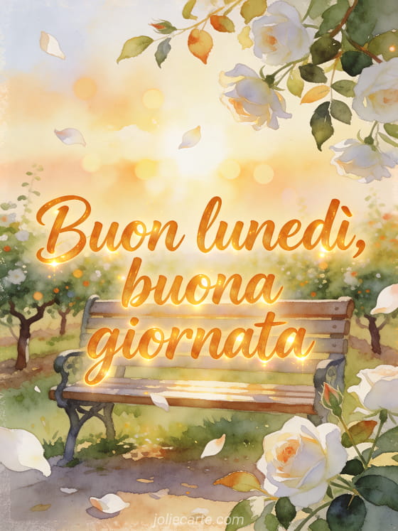 Invia un saluto ottimista di lunedì con scritte ambrate ad acquerello, una panchina in un frutteto radioso, cielo luminoso e petali di rosa bianca oltre il bordo. Puoi condividere anche buon lunedì baci belle immagini, una buon lunedì citazione immagine o una buon lunedì sotto la pioggia immagine.