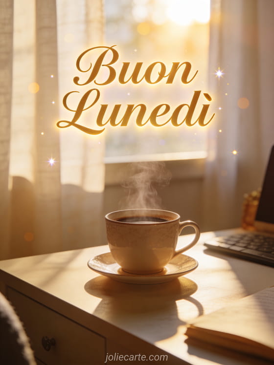 Inizia la settimana con energia positiva inviando questo bellissimo biglietto di buon lunedì. Una tazza di caffè fumante su una scrivania accogliente, avvolta nella calda luce dell'alba attraverso morbide tende. Scopri anche un biglietto di lunedì positivo con citazione o un biglietto di lunedì buon inizio settimana.