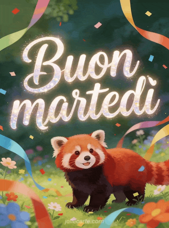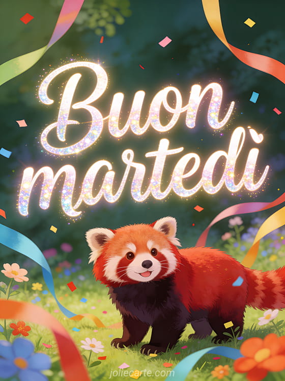 Condividi buon martedì animali con calligrafia giocosa, un panda rosso in un prato festoso, festoni, fiori e coriandoli colorati. Puoi inviare anche buon martedì belle immagini animate, una buon martedì pioggia immagine o buon martedì Facebook immagini.