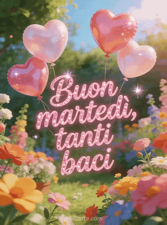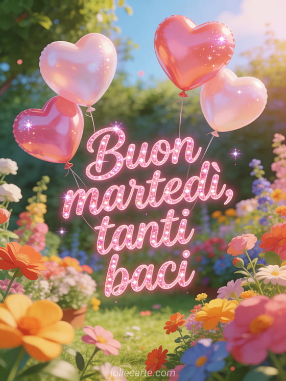 Invia un saluto tenero di buon martedì con calligrafia rosa arrotondata e scintillante, palloncini a cuore sopra un giardino colorato, bagliore caldo e glitter leggero. Puoi vedere anche questa immagine buon martedì baci, questa buon martedì umorismo immagine o questa buon martedì cartolina virtuale.