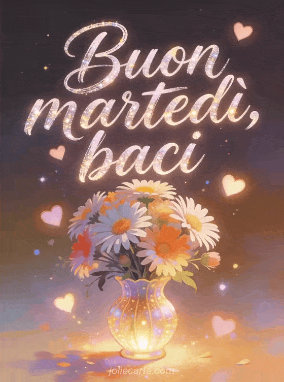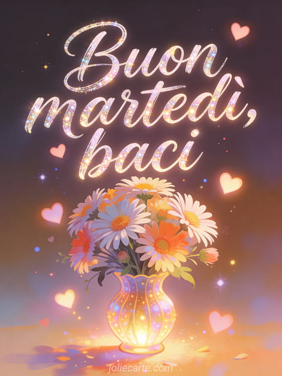 Condividi buon martedì con baci in una cartolina con scritta brillante, un bouquet vivace di aster in un vaso luminoso, cuori fluttuanti e scintille delicate. Scopri anche buon martedì buona giornata gif, buon martedì baci gif o buongiorno buon martedì baci immagine.
