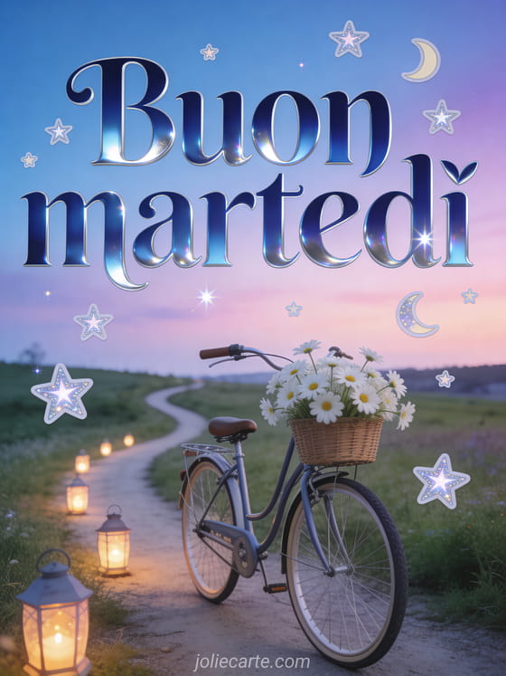 Invia una cartolina romantica di buon martedì con lettere blu notte, riflessi argentati, stelle scintillanti, piccole lune e una bicicletta vintage con un cestino pieno di margherite bianche su un sentiero di campagna sinuoso all'ora blu. Scopri anche buongiorno buon martedì immagine, immagine divertente buon martedì umorismo o buongiorno martedì cartolina.