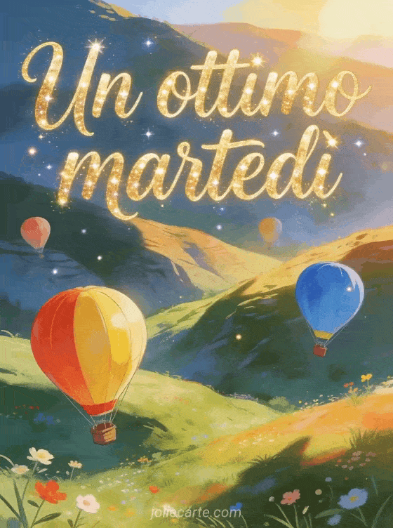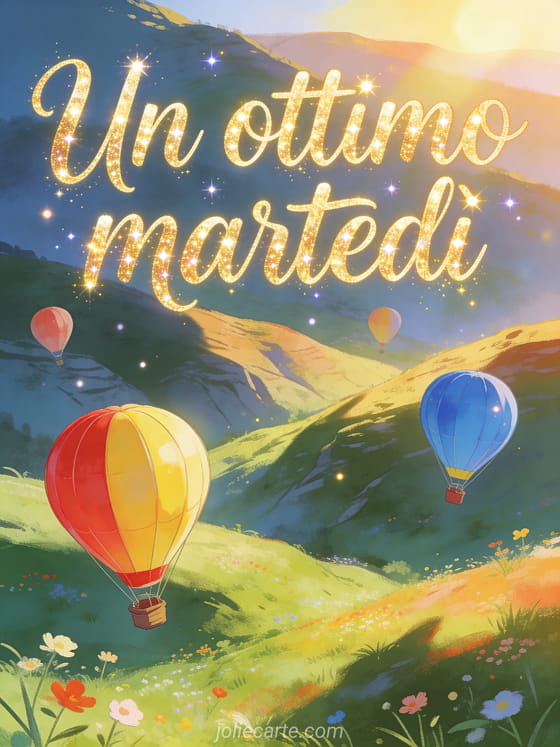 Condividi una cartolina virtuale di buon martedì con calligrafia dipinta, mongolfiere colorate sopra una valle soleggiata e morbide colline. Puoi inviare anche buon martedì gif, martedì baci gif o buon martedì immagine gratis.