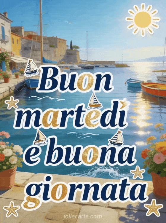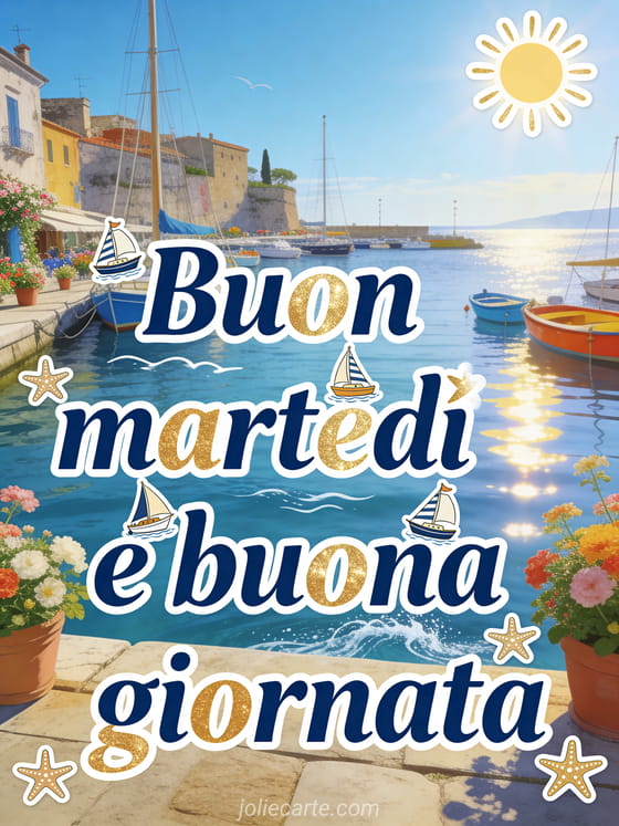 Invia un allegro saluto di buon martedì con scritte blu navy, tocchi dorati, barche a vela e stelle marine intorno a un vecchio porto soleggiato. Puoi vedere anche queste buon martedì baci immagini, questa buon martedì buona giornata gif o queste buon martedì baci gif.