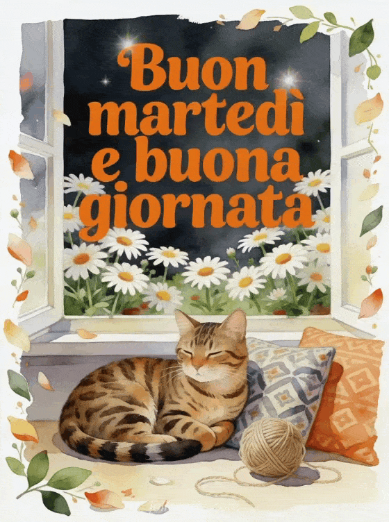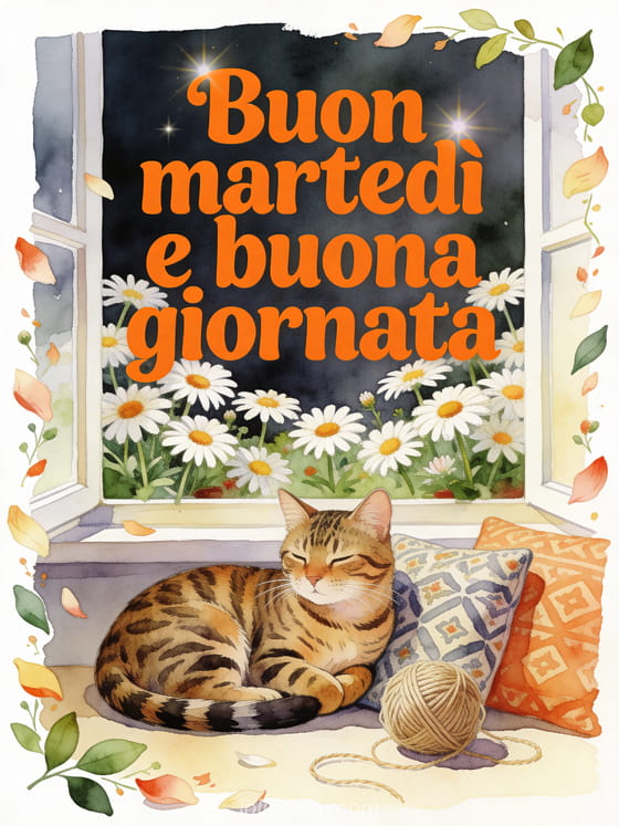 Condividi un messaggio accogliente di buon martedì con un gatto bengal accanto a una finestra con margherite, un gomitolo di lana e cuscini decorati. Puoi inviare anche un buongiorno buon martedì gif, buon martedì cartoline o una buon martedì immagine scintillante.