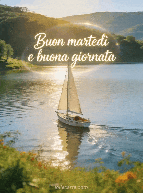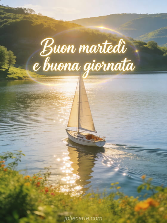 Invia un saluto caloroso di buon martedì con scritta elegante e luminosa, una barca a vela su un lago scintillante sotto un cielo chiaro, rive verdi e luce naturale realistica. Puoi vedere anche questa buona giornata di martedì gif, queste buon martedì baci immagini gratis o questa immagine buon martedì baci.