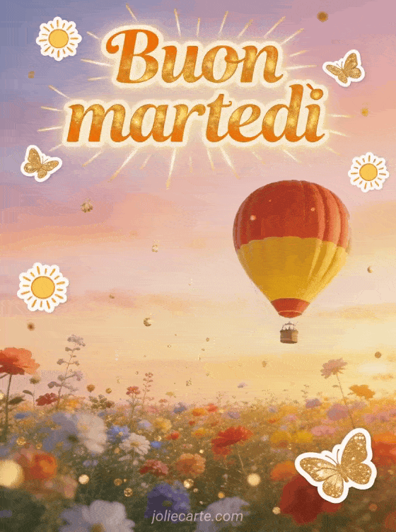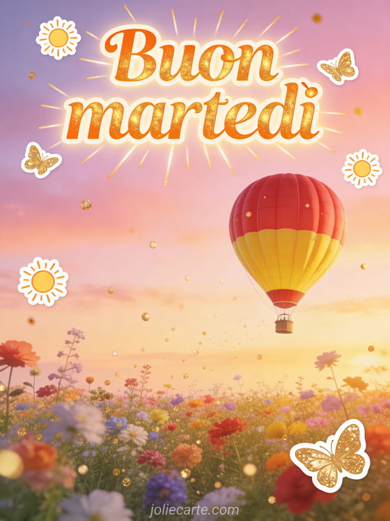 Invia un biglietto caloroso di buon martedì con lettere arancio dorato, piccoli soli, farfalle dorate e una mongolfiera rossa e gialla che fluttua sopra un campo fiorito multicolore al tramonto pastello. Scopri anche buon martedì paesaggio immagine, buona giornata di martedì gif o buon martedì baci immagini gratis.