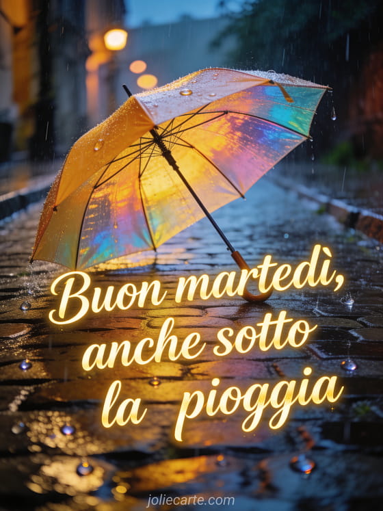 Condividi buon martedì sotto la pioggia con testo elegante scritto a mano, un ombrello luminoso su un sentiero di ciottoli bagnati e riflessi colorati. Puoi inviare anche buon martedì immagini gratis, buon martedì cartoline virtuali o buon martedì gif.