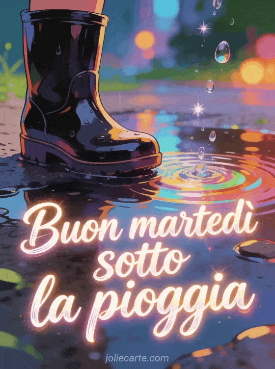Condividi una immagine di buon martedì sotto la pioggia con scritte radianti, uno stivale da pioggia lucido accanto a pozzanghere vivaci e gocce scintillanti. Puoi inviare anche buon martedì gifs, un buon martedì sotto la pioggia gif o buon martedì immagini gratis.