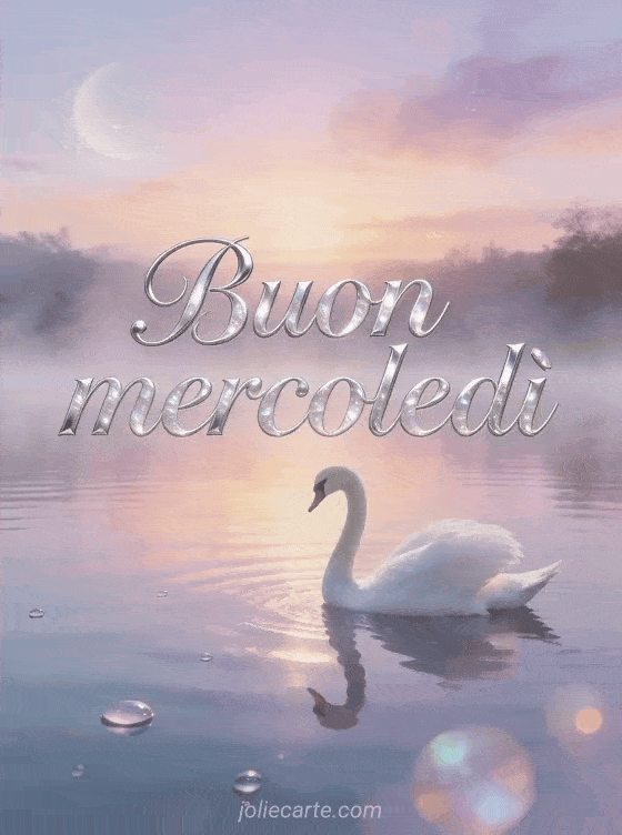 Invia un elegante augurio di buon mercoledì con un cigno bianco che scivola su un lago a specchio all'alba, tra nebbia leggera e riflessi pastello. Scopri anche buon mercoledì montagna, immagini animate buon mercoledì o buongiorno mia bella mercoledì.