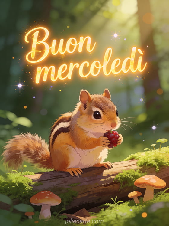 Invia un saluto adorabile di buon mercoledì con uno scoiattolo striato soffice che tiene una bacca su un tronco muschioso, circondato da funghi e luce filtrata della foresta. Scopri anche buongiorno buona giornata buona giornata di mercoledì, immagine animata buon mercoledì o ciao buon mercoledì umorismo.