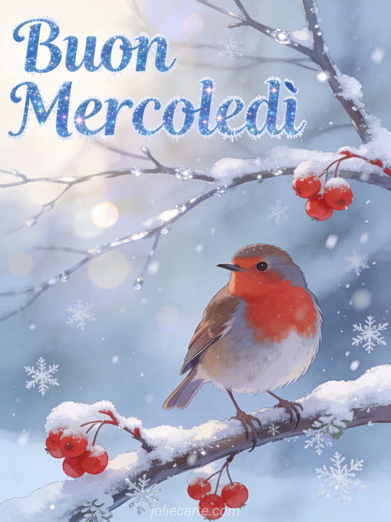 Condividi un sereno augurio di mercoledì invernale con questo tranquillo biglietto con un incantevole pettirosso su un ramo innevato con frutti rossi. Scopri anche buon mercoledì o sms per dire buon mercoledì per altra ispirazione.