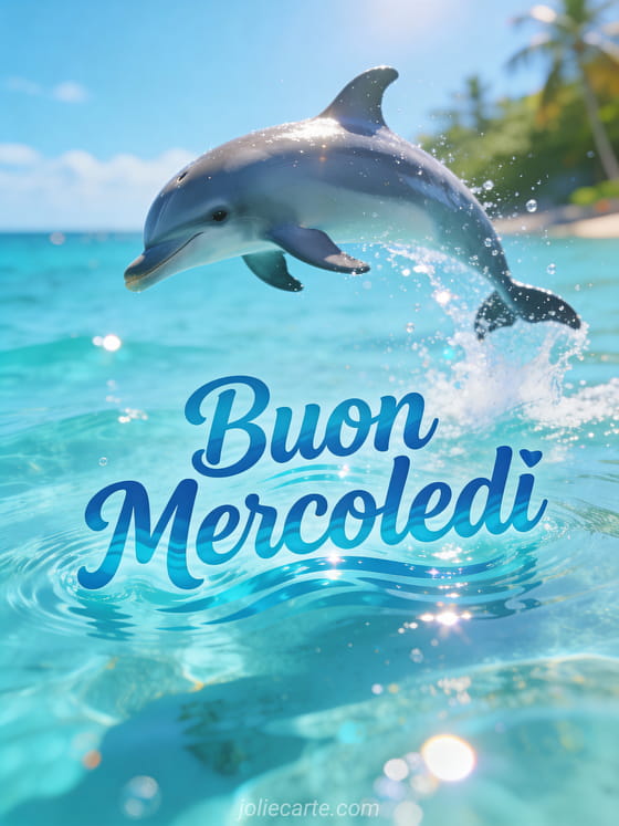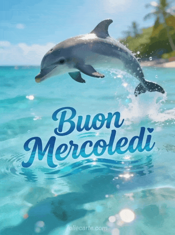 Condividi un gioioso augurio di buon mercoledì con questo energico gif animato con un delfino giocoso che salta dall'acqua turchese cristallina. Scopri anche gif animato bacio buon mercoledì o buongiorno per mercoledì per altra ispirazione.