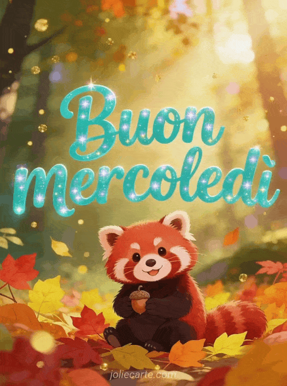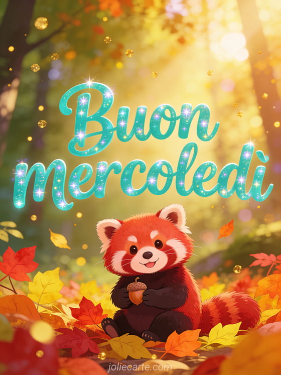Invia un saluto adorabile di buon mercoledì con un panda rosso allegro tra foglie d'autunno colorate, che tiene una piccola ghianda sotto la luce dorata. Scopri anche buon mercoledì sotto la pioggia gif, buon mercoledì con vento o buongiorno buon mercoledì immagini.