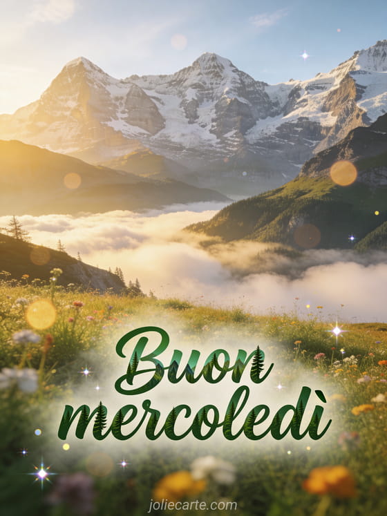 Invia un saluto sereno di buon mercoledì con vette alpine innevate, un prato di fiori selvatici e luce dorata del mattino sopra nuvole alla deriva. Scopri anche immagini animate buon mercoledì, buongiorno mia bella mercoledì o buongiorno buon mercoledì immagine.