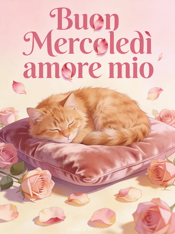 Condividi un amorevole augurio di buon mercoledì con questo tenero biglietto romantico con un gatto rosso addormentato su un cuscino di velluto circondato da rose. Scopri anche buon mercoledì gif animato o buon piccolo caffè del mercoledì per altra ispirazione.