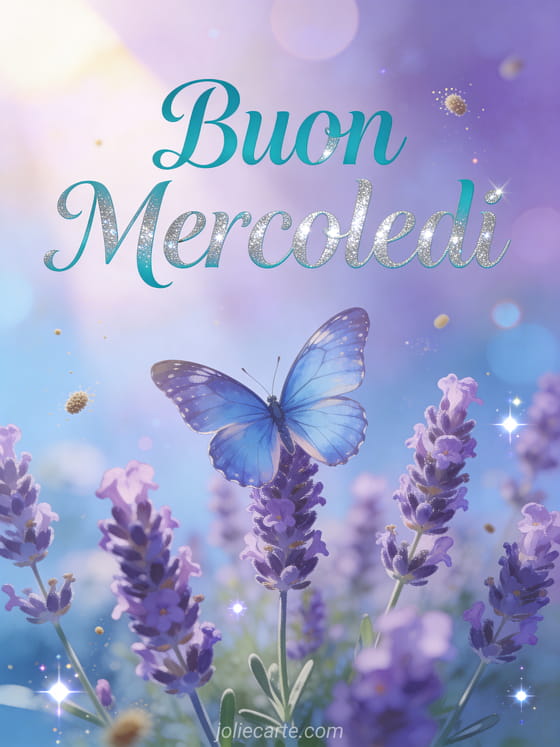 Augurate un buon mercoledì con questo sereno biglietto virtuale. Una maestosa farfalla blu morpho riposa su fiori di lavanda in un giardino immerso in una dolce luce violetta. Scoprite anche un biglietto di buon mercoledì, un biglietto di buon mercoledì o un biglietto di buongiorno e buon mercoledì.