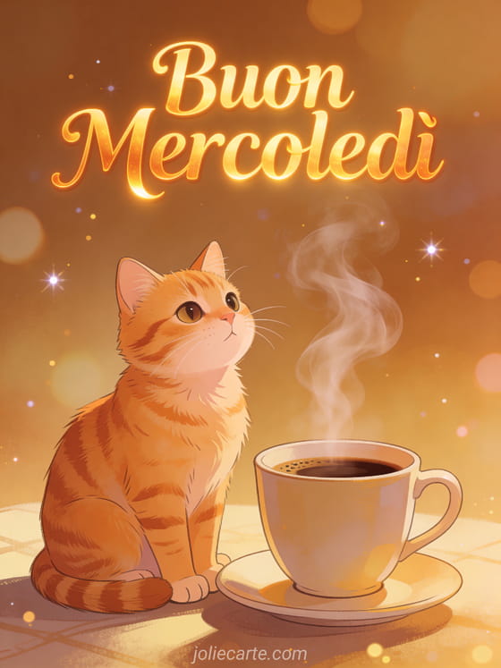 Augurate un buon mercoledì con questo accogliente biglietto virtuale. Un adorabile gatto tigrato arancione seduto accanto a una tazza di caffè fumante trasmette calore e buon umore per iniziare la giornata. Scoprite anche un biglietto di buon mercoledì, un biglietto di buongiorno e buon mercoledì o un biglietto di buon mercoledì buona giornata.