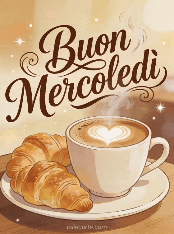 Inizia il mercoledì con la sensazione di un caffè caldo e croissant grazie a questa accogliente cartolina. Scopri anche una gif animato bacio buon mercoledì o una cartolina buongiorno per mercoledì.