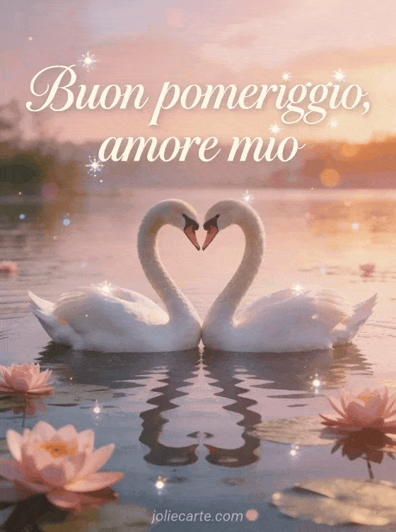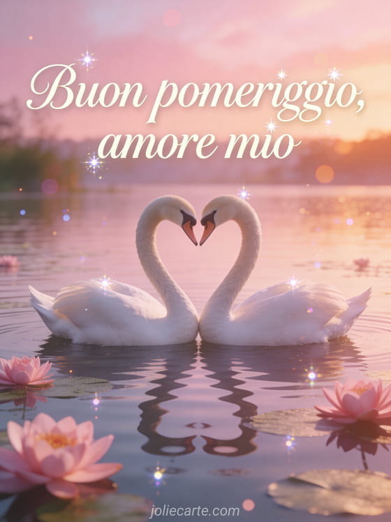 Invia questo romantico buon pomeriggio amore mio con due cigni che formano un cuore su un lago tranquillo con ninfee rosa riflesse nella luce soffice del tramonto. Scopri anche una cartolina buon pomeriggio tanti baci immagine o una cartolina augurare buon pomeriggio immagine.
