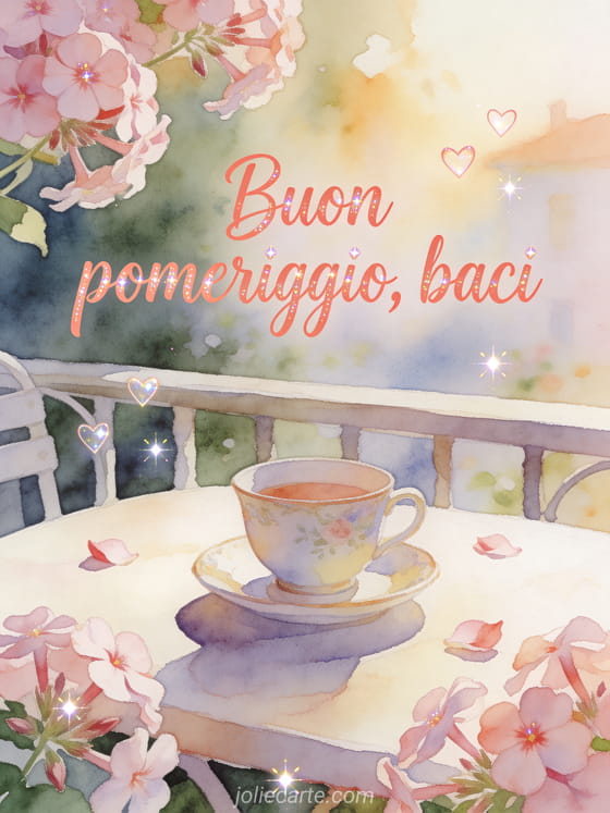 Rendi più dolce il pomeriggio con un biglietto ad acquerello in toni corallo, fiori di phlox e una tazza su una terrazza accogliente. Puoi inviare anche bel pomeriggio baci immagine, baci del pomeriggio o amicizia buon fine pomeriggio baci.