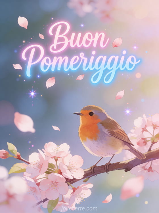 Invia un meraviglioso augurio di buon pomeriggio con un pettirosso sui fiori di ciliegio. Scopri anche una immagine buon pomeriggio, delle immagini buon pomeriggio o una immagine buon pomeriggio amore mio.