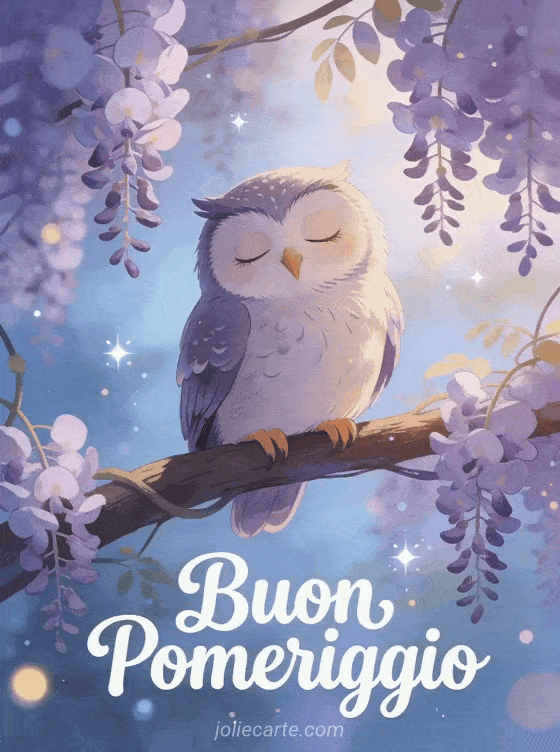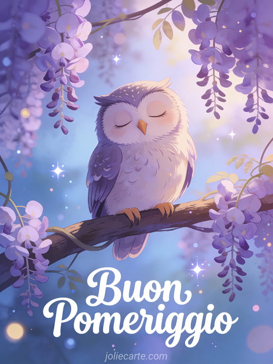 Condividi un'immagine di buon pomeriggio con questa incantevole cartolina di gufo e glicini. Scopri anche immagini buon pomeriggio o una immagine buon pomeriggio amore mio.