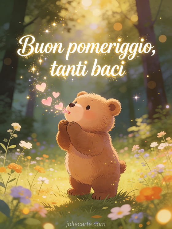 Invia questo adorabile buon pomeriggio con tanti baci con un orsetto paffuto che manda baci a forma di cuore in una radura piena di fiori selvatici. Scopri anche una cartolina augurare buon pomeriggio immagine o una cartolina buon pomeriggio immagine.