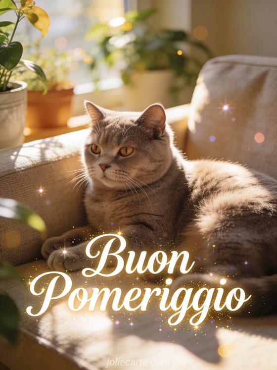 Condividi un saluto di buon pomeriggio con questa accogliente cartolina di gatto british shorthair. Scopri anche buon pomeriggio gifs o una buon pomeriggio immagine.