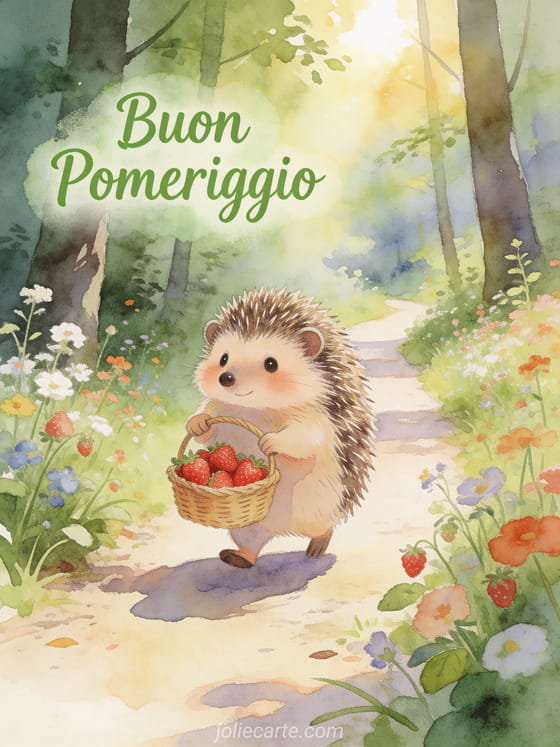 Rallegra il pomeriggio di qualcuno con questo adorabile biglietto che presenta un simpatico riccio con un cestino di fragole su un sentiero soleggiato nel bosco con fiori selvatici, dipinto in morbido stile acquerello. Scopri anche un buon pomeriggio o un buon pomeriggio divertente.
