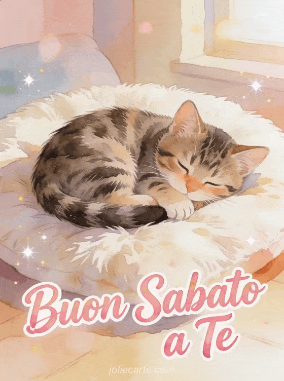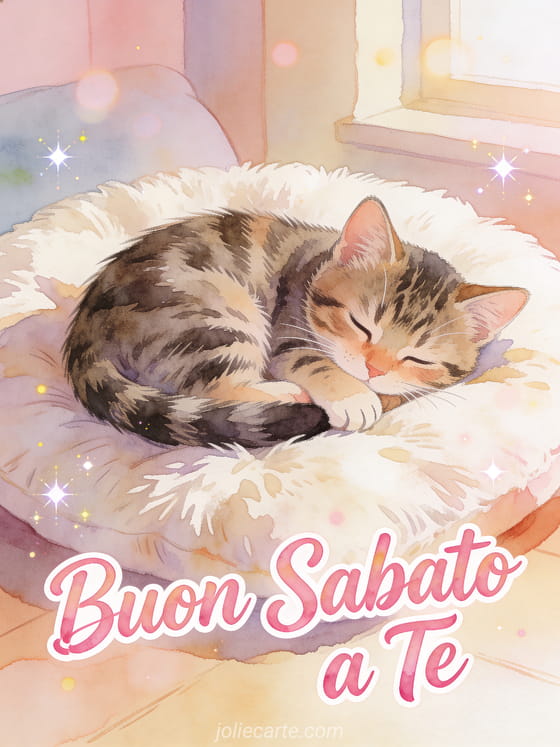 Invia un tenero saluto di buon sabato con un adorabile gattino tigrato acciambellato su un cuscino morbido in toni pastello. Un dolce modo per augurare un meraviglioso e accogliente sabato. Scopri anche una cartolina sabato con gatto o una cartolina buona giornata sabato.