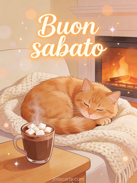 Invia un saluto accogliente di buon sabato con un soffice gatto rosso acciambellato su una coperta lavorata a maglia accanto a cioccolata calda con marshmallow e luce del camino. Scopri anche buongiorno buona giornata buon sabato, buon sabato baci immagine o buon sabato immagine gratuita.