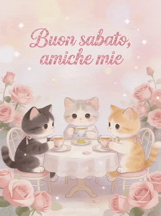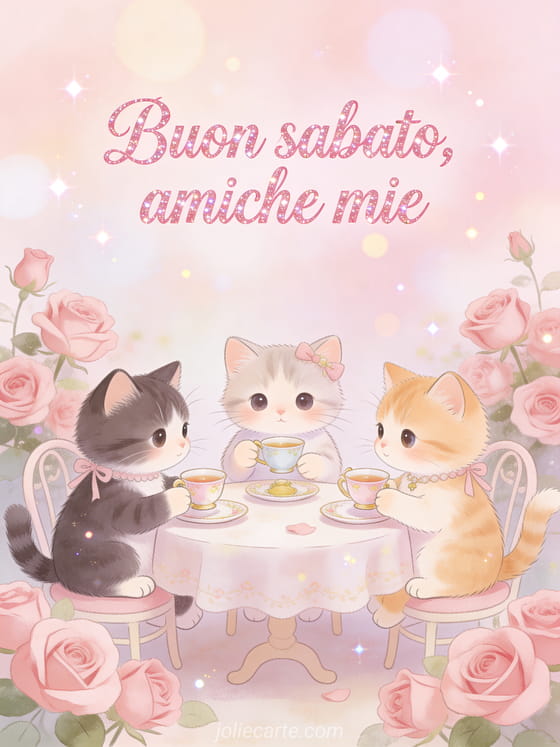 Condividi un dolce saluto di sabato con tre gattini carini a una festa del tè, tazzine, rose rosa e morbidi colori pastello. Puoi anche inviare immagine animata buon sabato o buon sabato a tutti gif.