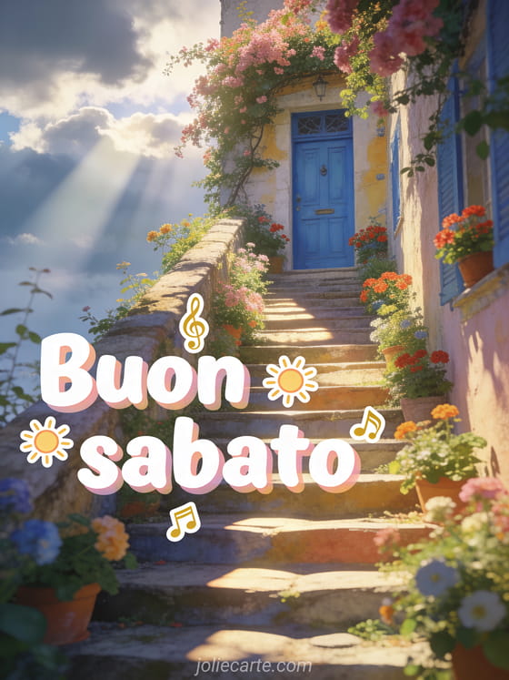 Invia buon sabato amici gif con lettere bianche gioiose, piccoli soli, note musicali dorate e una scalinata fiorita verso una porta blu mediterranea. Condividi un augurio gioioso per il weekend e scopri anche amicizia buon sabato buon weekend, buongiorno buon sabato baci o paesaggio buon sabato paesaggio.