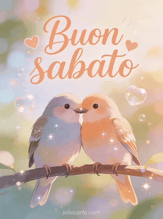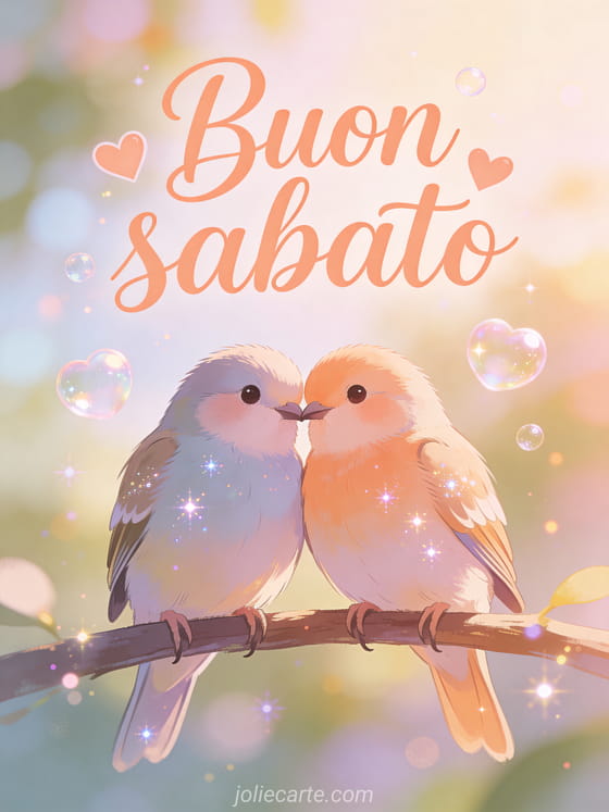 Condividi una immagine di buon sabato baci con due inseparabili su un posatoio condiviso, circondati da scrittura color pesca e bolle a cuore in una dolce scena del mattino. Invia altro affetto di sabato con buon sabato immagine gratuita, cartolina virtuale gratuita buon sabato o buongiorno sabato immagine.