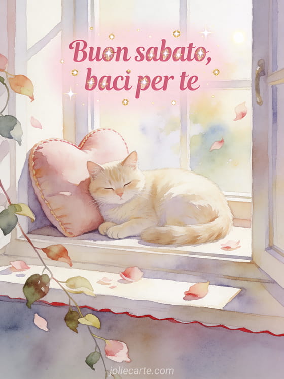 Invia un saluto tenero di buon sabato con lettere rosa arrotondate, punti dorati, un gatto crema accanto a un cuscino a forma di cuore in un angolo di finestra luminoso, petali e foglie ricadenti. Puoi condividere anche buon sabato immagini invernali, buongiorno e buon sabato gif o buon sabato mia amica immagine.
