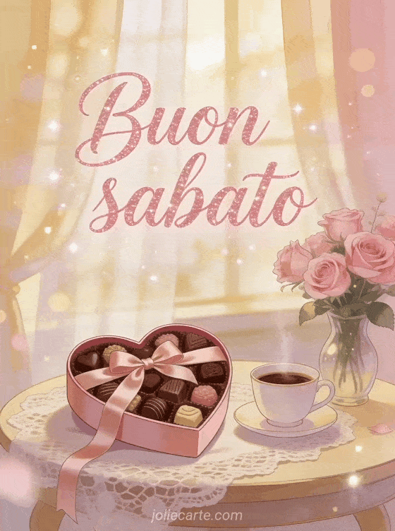 Invia un tenero saluto di buon sabato con scritta rosa tenue, cuori scintillanti e una scatola di cioccolatini con fiocco per una morbida mattina del weekend. Scopri anche una immagine animata di buon sabato, una gif donna di buon sabato o una gif buon sabato tanti baci.