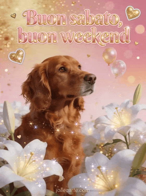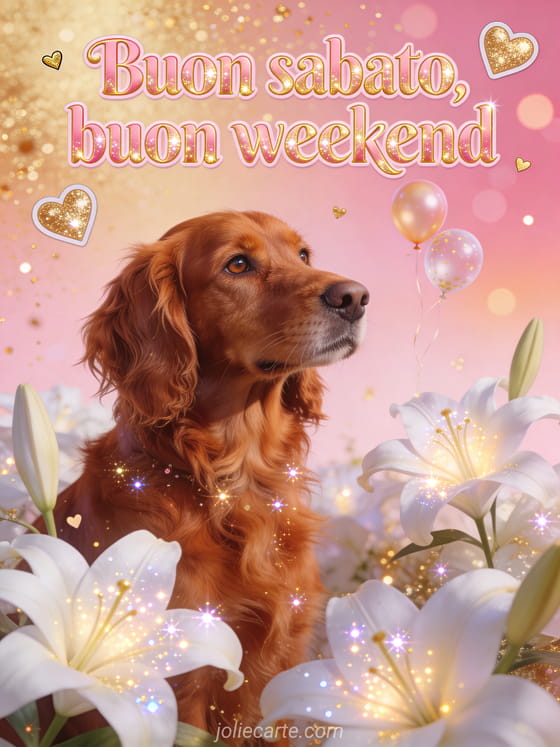 Condividi una cartolina luminosa di buon sabato e buon weekend con lettere rosa dorato, cuori dorati, piccoli palloncini, gigli bianchi splendenti e un setter irlandese rosso dallo sguardo caldo. Scopri anche buongiorno buon sabato Natale, queste buon sabato immagini divertenti o un saluto buon sabato con gatti.