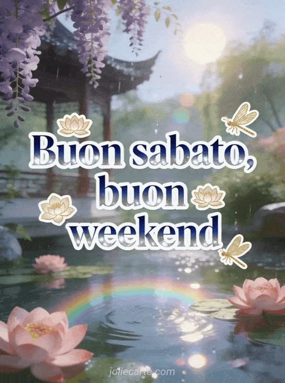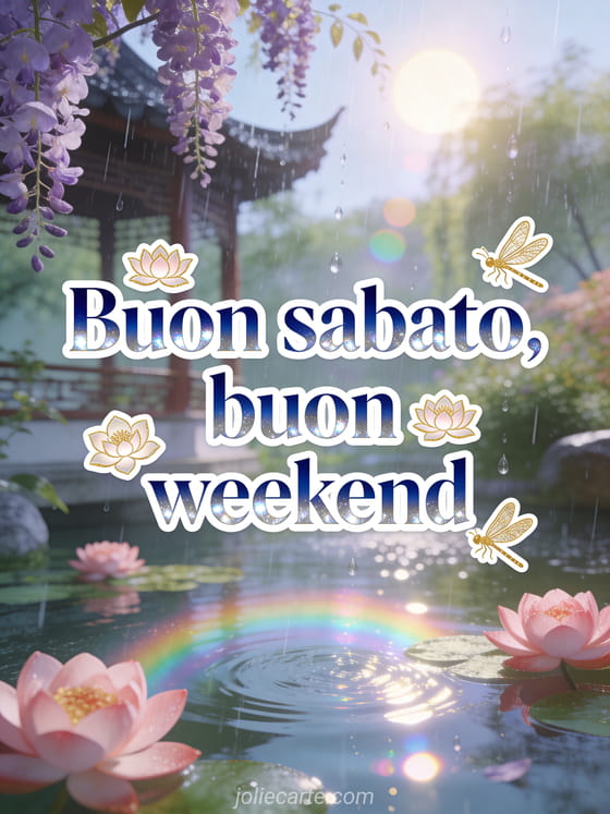 Condividi un buon sabato e buon weekend sereno con un padiglione in giardino asiatico, glicine viola, fiori di loto rosa e libellule dorate sotto la pioggia estiva. Scopri anche felice sabato e buon weekend, una buon sabato immagine o buon sabato immagini.