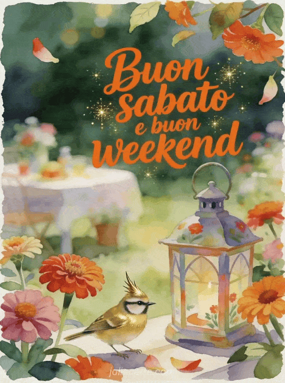 Condividi buon sabato e buon weekend con una scena di giardino ad acquerello in cui un piccolo regolo crestato è posato su una lanterna dipinta tra zinnie vivaci. Puoi inviare anche un sabato buongiorno gif, una buon sabato con il sole immagine o una gif buon sabato baci.