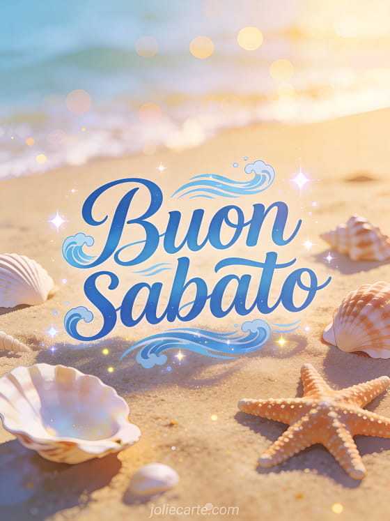 Condividi buon sabato buon weekend con conchiglie e stelle marine su una spiaggia sabbiosa in una tranquilla scena costiera del mattino. Porta più gioia al weekend con buongiorno buon sabato gif animate, buon sabato smiley o buon sabato con i gatti.