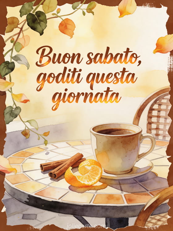 Condividi una cartolina accogliente di sabato con una tazza di caffè in ceramica, stecche di cannella, scorza luminosa di agrume e luce dorata del mattino su un tavolino da caffè. Puoi anche inviare buon sabato a tutti immagine, scegliere buongiorno è sabato immagine o condividere buon sabato gif.