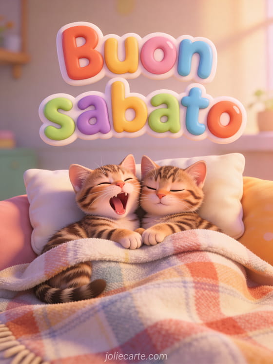 Condividi buon sabato con i gatti in una calda illustrazione 3D con lettere tonde colorate, due adorabili gattini tigrati accoccolati su una coperta accogliente, cuscini morbidi e luce delicata del mattino. Scopri anche immagini baci del sabato o buon sabato sera baci.