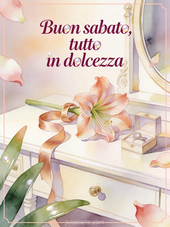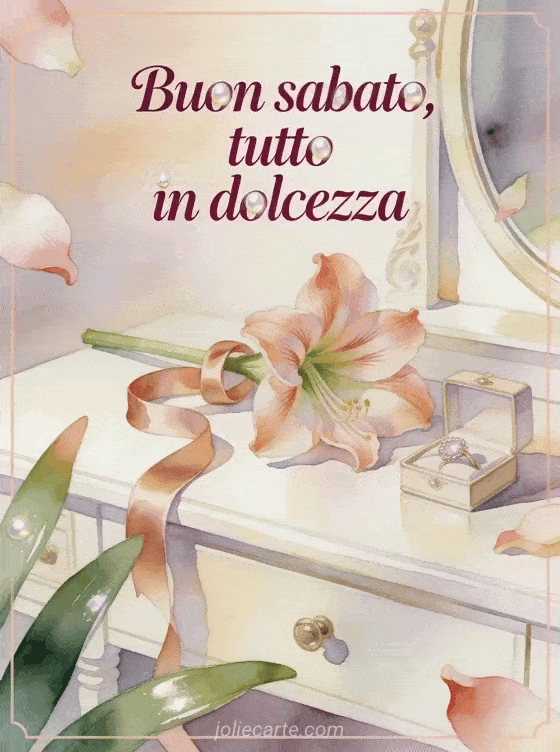 Invia un augurio dolce di sabato con un fiore di amarilli, un nastro di raso, un piccolo portagioie e una toeletta luminosa. Scopri anche gif buon sabato tanti baci, buon sabato sera gif o buon sabato neve gif.