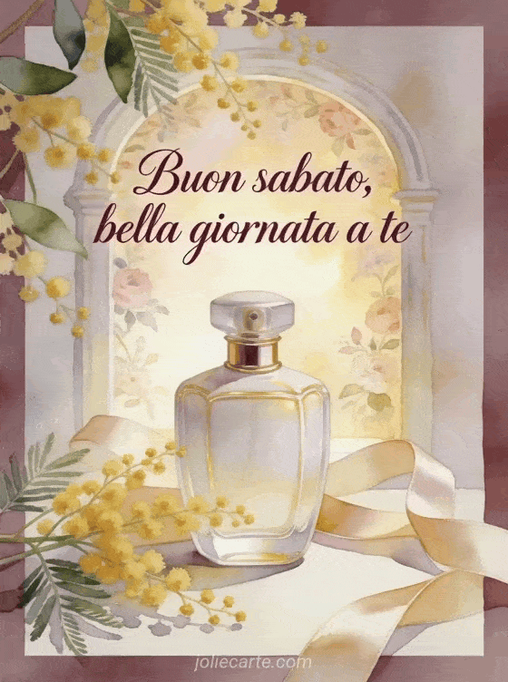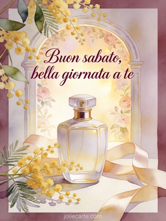Regala un momento raffinato del sabato con un flacone di profumo in porcellana ad acquerello, rami ariosi di mimosa, nastri satinati e un'alcova fiorita luminosa. Scopri anche buon sabato caffè gif, buon sabato a tutti immagine o buongiorno è sabato immagine.