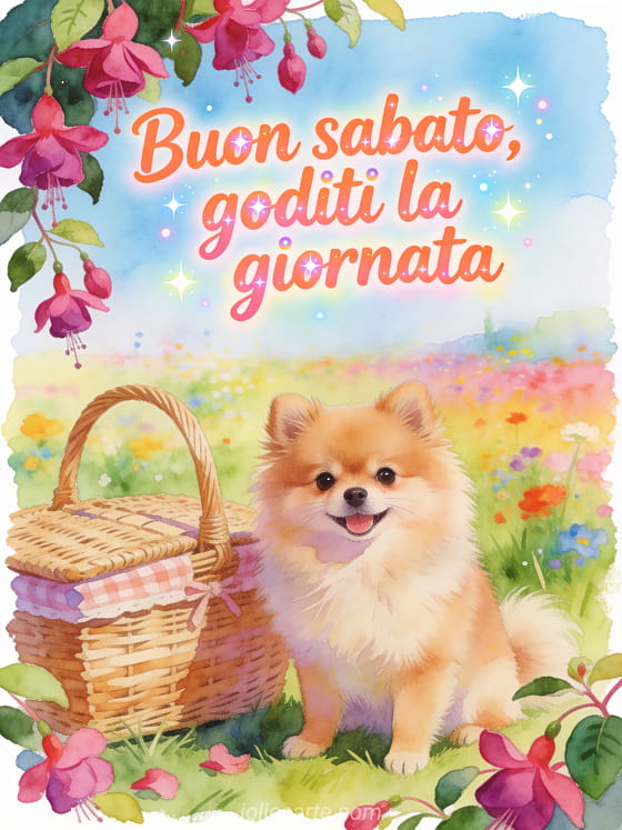 Condividi una gif animata di buon sabato con lettere corallo, un Volpino di Pomerania in miniatura, un cestino da picnic in vimini e fiori di fucsia pendenti su un prato vivace. Puoi inviare anche buonissimo sabato gif, immagini gratis buon sabato e buon weekend o buon sabato e weekend immagine.