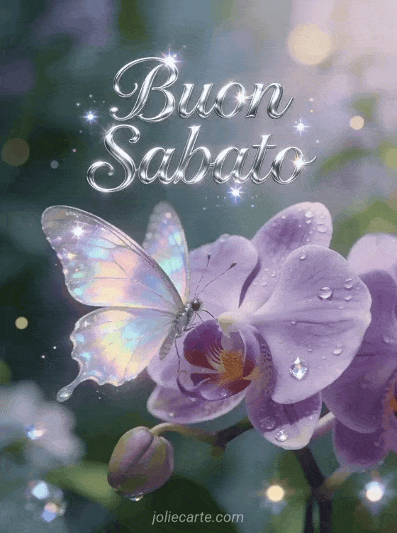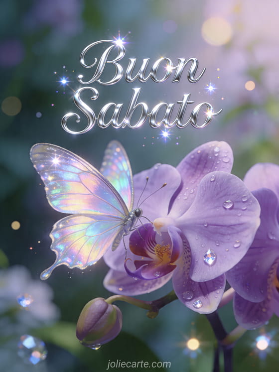 Condividi un magico Buon sabato con questa cartolina gratis che mostra una farfalla scintillante su un'orchidea viola in un giardino da sogno. Scopri anche buon sabato buona giornata, buon sabato belle immagini buon fine settimana o cartolina buon sabato gratis.