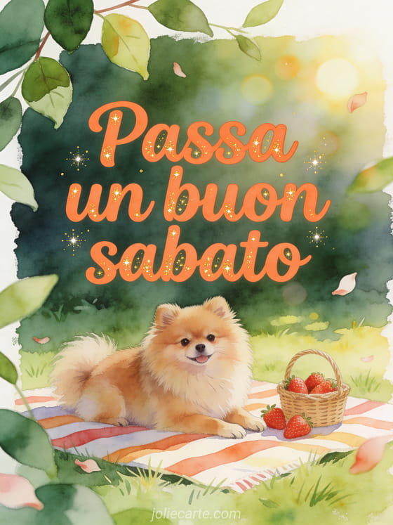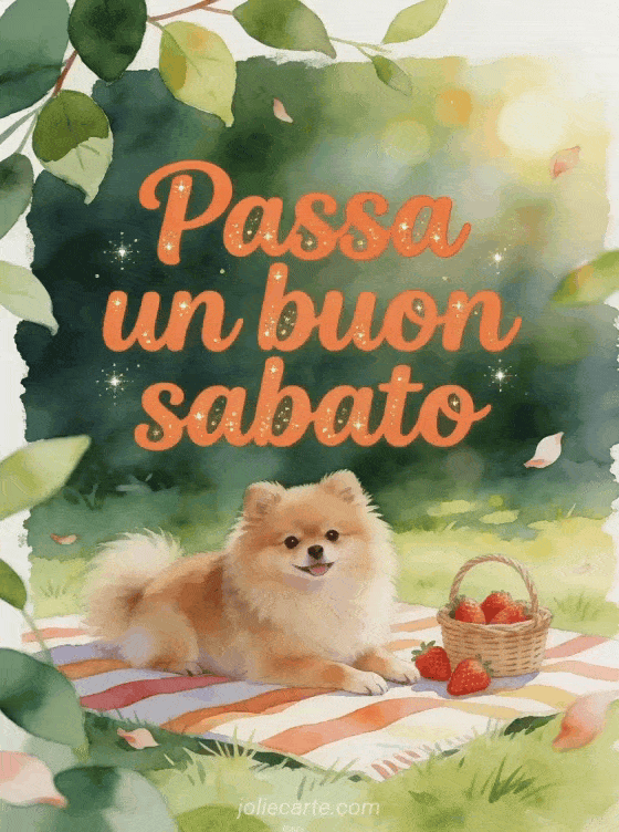 Condividi una gif di buon sabato con lettere corallo, un Volpino di Pomerania soffice accanto a una coperta da picnic a righe, fragole e un cestino di vimini su un prato soleggiato. Puoi inviare anche un'immagine citazione buon sabato, una bellissima immagine di buon sabato o buon sabato baci gif.