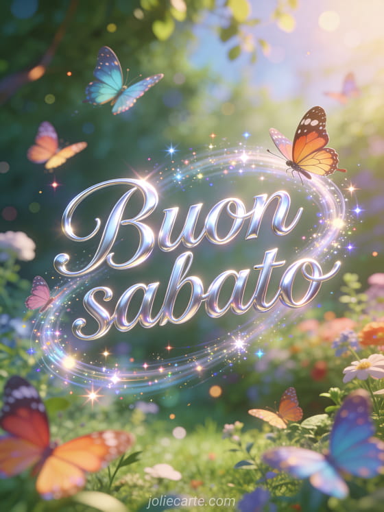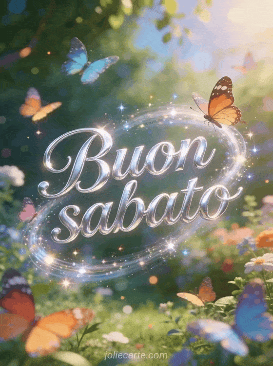 Condividi un'immagine animata di buon sabato con scritte argentate scintillanti, farfalle colorate e un giardino incantato da sogno. Scopri anche una buon sabato donna gif o una gif buon sabato tanti baci.